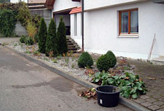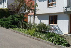 Ganzjährig attraktive, pflegeleichte und übersichtliche Beetfläche vor Praxiseingang |