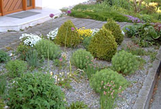 Immergrüne in Kombination mit Stauden und Gräsern. Einarbeitung von Splitt in den Boden und zugleich Auflage zur besseren Erwärmung.