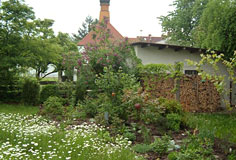 Mit buntlaubigen Sträuchern und zum Teil immergrünen Gehölzen, aber auch mit Rosen und Lavendel sowie schattenverträglichen Stauden wurde der Hang neu bepflanzt. Holzhäcksel aus der Abholzaktion wurde als Mulchschicht aufgelegt, auch um den Unkrautdruck von der angrenzenden Weidefläche zu reduzieren. |